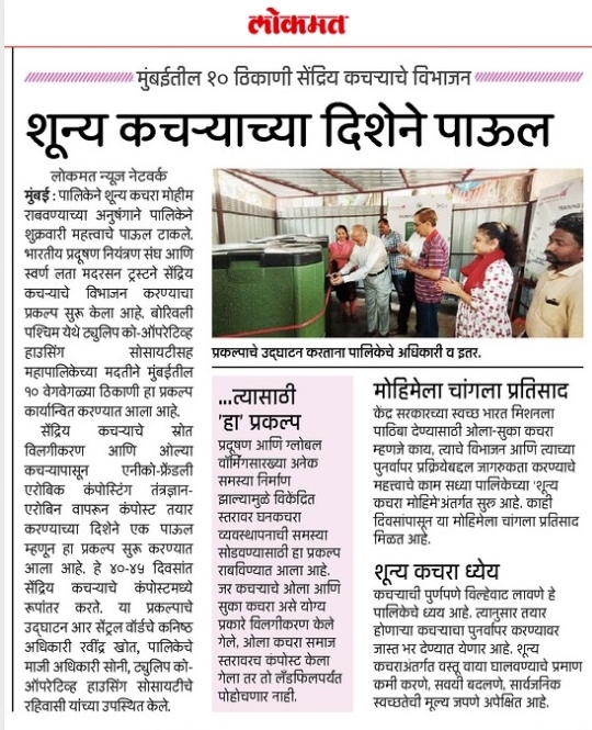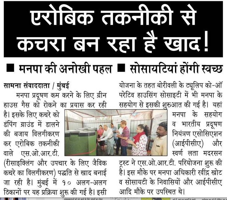 To support the “Clean India Mission” of Government of India,Indian Pollution Control Association (IPCA) & Swarn Lata Motherson Trust (SLMTT) has launched the project S.O.R.T.(Segregation of Organic Waste for Recycling & Treatment) with the support of Brihanmumbai Municipal Corporation (BMC) at Tulip Co-operative Housing Society, Borivali West Mumbai.